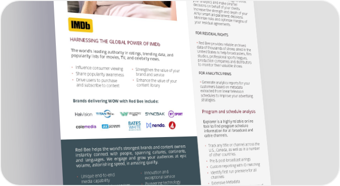 OTT LIVE PRODUCTION POST PRODUCTION MEDIA MANAGEMENT OTT LIVE & REMOTE PRODUCTION DISTRIBUTION MEDIA MANAGEMENT ACCESS SERVICES POST PRODUCTION CONTENT DISCOVERY PLAYOUT Red Bee helps the world’s strongest brands and content owners instantly connect with people, spanning cultures, continents, and languages. We engage and grow your audiences at epic volume, astonishing speed, in amazing quality. · Unique end-to-end media capability · Integrated modular services · Innovation and exceptional service · Pioneering technology Brands delivering WOW with Red Bee include: WOW YOUR AUDIENCE WITH RED BEE. If you're interested in Red Bee end-to-end services, then contact us to fi nd out more: www.redbeemedia.com HARNESSING THE GLOBAL POWER OF IMDb The world’s leading authority in ratings, trending data, and popularity lists for movies, TV, and celebrity news. · Influence consumer viewing · Share popularity awareness · Drive users to purchase and subscribe to content · Strengthen the value of your brand and service · Enhance the value of your content library · Track any title or channel across the U.S., Canada, as well as in a number of other countries. · Pre & post-broadcast airings · Custom reporting with ID matching · Identify first run premiere for all channels · Extensive Metadata · Up to 8 weeks of advance & years of archive schedule data · Used for residuals, compliance, barter, clearance/line-ups, and research · Also used by sales, legal, and other departments · Used in product management, for additional turns on inventory Program and schedule analysis Explorer is a highly reliable online tool to find program schedule information for all broadcast and cable channels. • Red Bee provides reliable archived data of thousands of shows aired in the United States to help broadcasters, film studios, professional sports leagues, production companies and distributors to monitor their valuable shows. FOR RESIDUAL RIGHTS FOR ANALYTICS FIRMS • Generate analytics reports for your customers based on metadata extracted from linear television schedules to improve your advertising strategies. ARCHIVED DATA Unleash the power of the most comprehensive linear scheduling data that can reference 10+ years of television history in North America. Red Bee Media’s archival data will help you create the perfect strategy to boost your analytics and make smarter decisions on behalf of your clients. Increase the strength and depth of your AI for smart ad placement decisions. Minimize risks and optimize margins of your residual agreements.