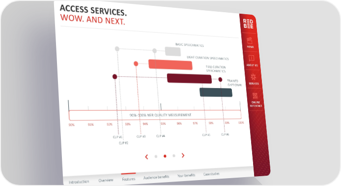 ACCESS SERVICES. WOW. AND NEXT. BASIC SPEECHMATICS HOME LIGHT CURATION SPEECHMATICS ABOUT US FULL CURATION SPEECHMATICS TRAINED SERVICES CAPTIONER ONLINE REFERENCE 90%-100% NER QUALITY MEASUREMENT 90% 91% 92% 93% 94% 95% 96% 97% 98% 99% 100% CLIP #1 CLIP #3 CLIP #4 CLIP #5 CLIP #6 CLIP #2 Introduction Overview Features Audience benefits Your benefits Case studies