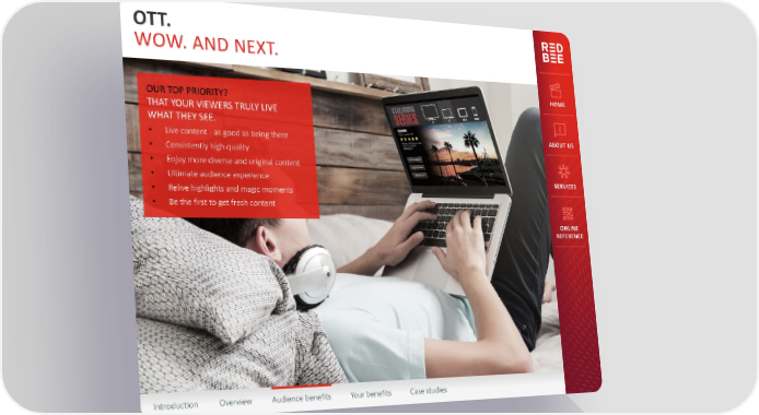 OTT. WOW. AND NEXT. OUR TOP PRIORITY? HOME THAT YOUR VIEWERS TRULY LIVE WHAT THEY SEE. • Live content - as good as being there ABOUT US • Consistently high quality • Enjoy more diverse and original content • Ultimate audience experience SERVICES • Relive highlights and magic moments • Be the first to get fresh content ONLINE REFERENCE Introduction Overview Audience benefits Your benefits Case studies