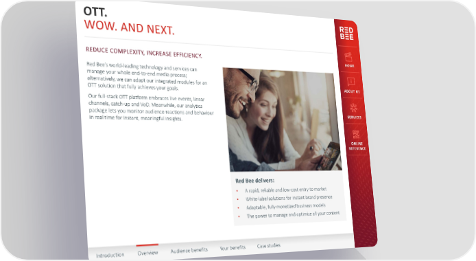 OTT. WOW. AND NEXT. REDUCE COMPLEXITY, INCREASE EFFICIENCY. HOME Red Bee’s world-leading technology and services can manage your whole end-to-end media process; alternatively, we can adapt our integrated modules for an ABOUT US OTT solution that fully achieves your goals. Our full-stack OTT platform embraces live events, linear channels, catch-up and VoD. Meanwhile, our analytics package lets you monitor audience reactions and behaviour SERVICES in real time for instant, meaningful insights. ONLINE REFERENCE Red Bee delivers: • A rapid, reliable and low-cost entry to market • White-label solutions for instant brand presence • Adaptable, fully monetized business models • The power to manage and optimize all your content Introduction Overview Audience benefits Your benefits Case studies
