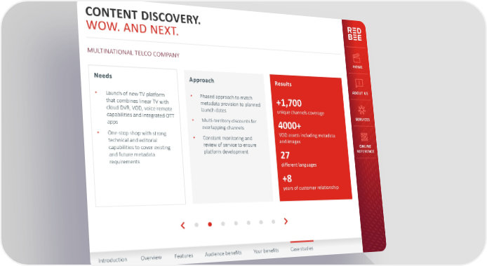 CONTENT DISCOVERY. WOW. AND NEXT. MULTINATIONAL TELCO COMPANY HOME Needs Approach Results ABOUT US • Launch of new TV platform • Phased approach to match +1,700 that combines linear TV with metadata provision to planned cloud DVR, VOD, voice remote launch dates unique channels coverage capabilities and integrated OTT • Multi-territory discounts for SERVICES apps overlapping channels 4000+ • One-stop shop with strong • Constant monitoring and VOD assets including metadata technical and editorial review of service to ensure and images ONLINE capabilities to cover existing platform development REFERENCE and future metadata 27 requirements different languages +8 years of customer relationship Introduction Overview Features Audience benefits Your benefits Case studies