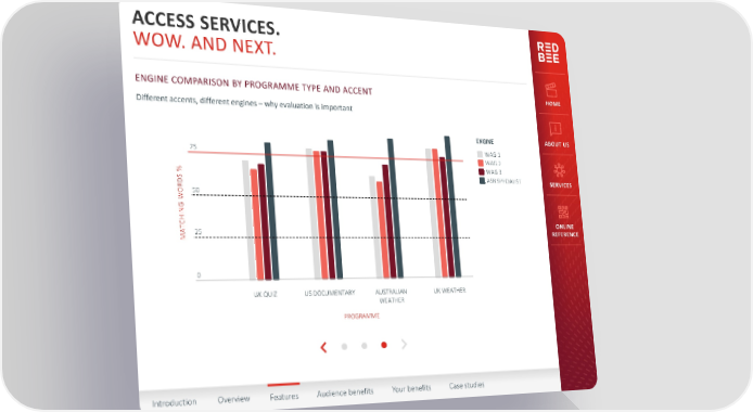 ACCESS SERVICES. WOW. AND NEXT. ENGINE COMPARISON BY PROGRAMME TYPE AND ACCENT HOME Different accents, different engines – why evaluation is important ENGINE ABOUT US 75 WAG 1 WAG 2 % WAG 3 S ASR SPECIALIST SERVICES D R 50 WO G N I H ONLINE TC 25 REFERENCE MA 0 UK QUIZ US DOCUMENTARY AUSTRALIAN UK WEATHER WEATHER PROGRAMME Introduction Overview Features Audience benefits Your benefits Case studies