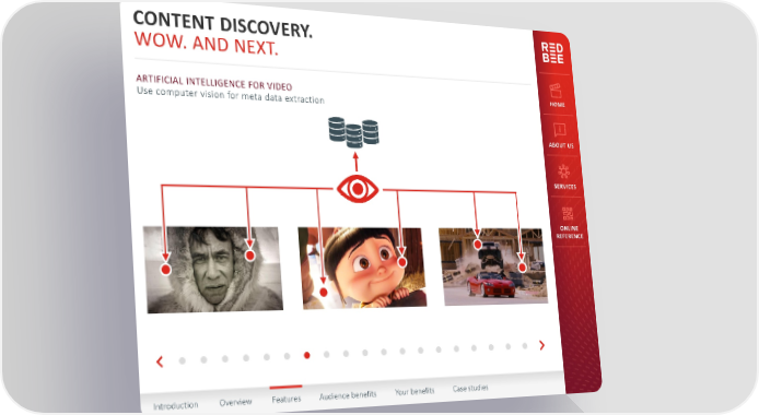 CONTENT DISCOVERY. WOW. AND NEXT. ARTIFICIAL INTELLIGENCE FOR VIDEO HOME Use computer vision for meta data extraction ABOUT US SERVICES ONLINE REFERENCE Introduction Overview Features Audience benefits Your benefits Case studies