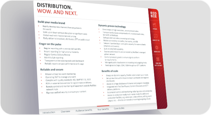 DISTRIBUTION. WOW. AND NEXT. Build your media brand Dynamic proven technology HOME • Rapidly develop new channels from anywhere in • Direct intake of high resolution, uncompressed video the world • Transport and process compressed and uncompressed video, • Scale up or down without disruption or significant costs SDI to IP, to Multicast • Global reach with flexible tailored pricing • Software defined video processing technology ABOUT US • Easily deliver to broadcast, distributor, OTT or public cloud • Mobile connectivity to studios, live events, and OB • Teleport: Satellite down-and uplink capacity for external feeds Finger on the pulse (channels and events) • Regular reporting with customer-defined KPIs • Built-in UHD/HDR capability SERVICES • Instant reporting for high-priority incidents • Sources and endpoints are connected by Red Bee’s managed • Regular Service Delivery Review global network • Monthly SLA reporting • Central processing pools to ensure signals conform • Transparent online booking tools and dashboard to requirements • Periodic reports on past performance and usage • Managed public cloud access to incoming and outgoing feeds ONLINE • Feed signals to Origin, CDN / UDN though our OTT platform REFERENCE Reliable and secure Benefits of scale • Mission-critical live event monitoring • Always-on dynamic capacity, flexible scale to meet your needs • Operating 24/7 to manage any event • Set up new links within hours to major worldwide and regional • Complies with quality standards: ISO, SMPTE2110, 2022 distributors • POPs in external data centres for signal intake or delivery • Access to a huge databases of channel and program metadata • Remote control and monitoring of equipment outside Red Bee • Integrated with Red Bee Playout, Content Discovery and OTT network hubs delivery platforms • Rigorous audited security to ensure your content • Automated control and monitoring reducing costs and complexity • Access to production ready multi-rooms ready for additional production facilities, e.g. voice-over, video referee, editing, event playout etc. –directly connected to incoming/outgoing circuits Introduction Overview Audience benefits Your benefits Case studies