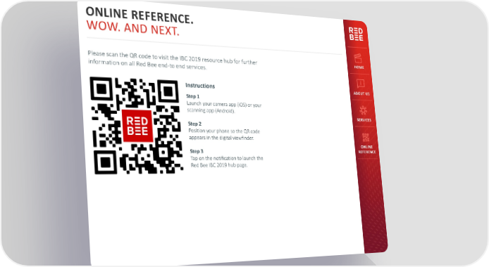 ONLINE REFERENCE. WOW. AND NEXT. Please scan the QR code to visit the IBC 2019 resource hub for further HOME information on all Red Bee end-to end services. Instructions ABOUT US Step 1 Launch your camera app (iOS) or your scanning app (Android). SERVICES Step 2 Position your phone so the QR code appears in the digital viewfinder. ONLINE Step 3 REFERENCE Tap on the notification to launch the Red Bee IBC 2019 hub page.