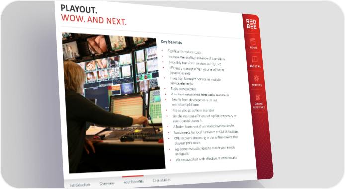PLAYOUT. WOW. AND NEXT. Key benefits HOME • Significantly reduce costs • Increase the quality/resilience of operations • Smoothly transform services to HD/UHD ABOUT US • Efficiently manage a high volume of live or dynamic events • Flexibility: Managed Service or modular service elements SERVICES • Easily customizable • Gain from established large-scale economies • Benefit from developments on our ONLINE centralized platform REFERENCE • Pay-as-you-go options available • Simple and cost-efficient set-up for temporary or event-based channels • A faster, lower-risk channel deployment model • Avoid needs for local hardware or CAPEX facilities • CPR recovers streaming in the unlikely event that playout goes down • Agreements customized to match your needs and goals • We respond fast with effective, trusted results Introduction Overview Your benefits Case studies