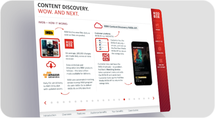 CONTENT DISCOVERY. WOW. AND NEXT. IMDb – HOW IT WORKS RBM Content Discovery IMDb API HOME RBM fetchesnew files daily as Customer platform soonas theyare posted. IMDb ID e.g. tt4154796 Customer has the ABOUT US IMDbID already– simple, just look up theRed BeeMedia IMDbAPI toreturn SERVICES On average, 100,000 changes theratings data. are made daily across all data received. Data validationand Customer does not have the ONLINE integrationinto RBM products IMDbID already–no problem. REFERENCE follows– the data is then Red Bee’sMatching Service made availablefordelivery. takes customer’sdata and adds theIMDbID andsendsback. RBM usesautomatedmatching Customer looks up theRed Bee Daily file set delivery service to map RBM program Media IMDbAPI toreturn the toAWS S3 bucket IDswithIMDbIDstodeliver ratings data. withupdatedassets. IMDbIDsin EPG data feed. Introduction Overview Features Audience benefits Your benefits Case studies