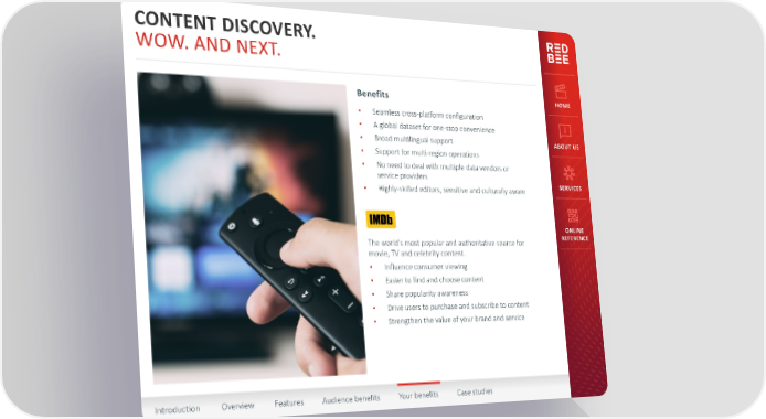 CONTENT DISCOVERY. WOW. AND NEXT. Benefits HOME • Seamless cross-platform configuration • A global dataset for one-stop convenience • Broad multilingual support ABOUT US • Support for multi-region operations • No need to deal with multiple data vendors or service providers • Highly-skilled editors, sensitive and culturally aware SERVICES ONLINE The world’s most popular and authoritative source for REFERENCE movie, TV and celebrity content. • Influence consumer viewing • Easier to find and choose content • Share popularity awareness • Drive users to purchase and subscribe to content • Strengthen the value of your brand and service Introduction Overview Features Audience benefits Your benefits Case studies