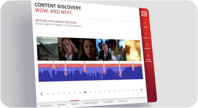 CONTENT DISCOVERY. WOW. AND NEXT. ARTIFICIAL INTELLIGENCE FOR AUDIO HOME Extract segments based on audio analysis ABOUT US SERVICES ONLINE REFERENCE Introduction Overview Features Audience benefits Your benefits Case studies