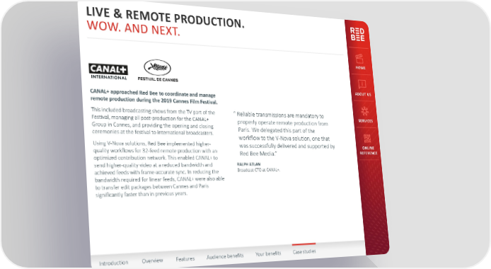 LIVE & REMOTE PRODUCTION. WOW. AND NEXT. HOME ABOUT US CANAL+ approached Red Bee to coordinate and manage remote production during the 2019 Cannes Film Festival. This included broadcasting shows from the TV part of the “ Reliable transmissions are mandatory to SERVICES Festival, managing all post-production for the CANAL+ properly operate remote production from Group in Cannes, and providing the opening and closing Paris. We delegated this part of the ceremonies at the festival to international broadcasters. workflow to the V-Nova solution, one that Using V-Nova solutions, Red Bee implemented higher- was successfully delivered and supported by ONLINE quality workflows for 32-feed remote production with an Red Bee Media.” REFERENCE optimized contribution network. This enabled CANAL+ to send higher-quality video at a reduced bandwidth and RALPH ATLAN achieved feeds with frame-accurate sync. In reducing the Broadcast CTO at CANAL+. bandwidth required for linear feeds, CANAL+ were also able to transfer edit packages between Cannes and Paris significantly faster than in previous years. Introduction Overview Features Audience benefits Your benefits Case studies