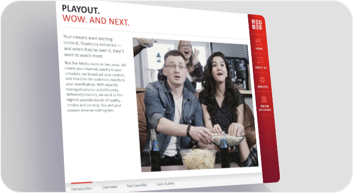 PLAYOUT. WOW. AND NEXT. Your viewers want exciting HOME content, flawlessly delivered — and when they’ve seen it, they’ll want to watch more. Red Bee Media excels in two areas. We ABOUT US create your channel, exactly to your schedule; we broadcast your content and brand to the audience, exactly to SERVICES your specification. With expertly managed services and efficiently delivered products, we work to the highest possible stands of quality, service and security. You and your ONLINE viewers deserve nothing less. REFERENCE Introduction Overview Your benefits Case studies
