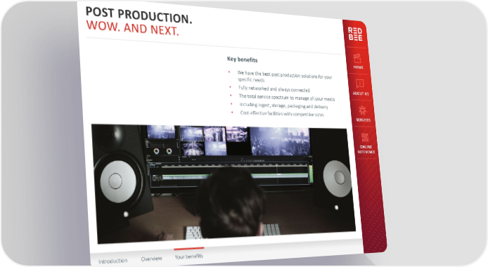 POST PRODUCTION. WOW. AND NEXT. Key benefits HOME • We have the best post production solutions for your specific needs • Fully networked and always connected ABOUT US • The total service spectrum to manage all your media • including ingest, storage, packaging and delivery • Cost-effective facilities with competitive rates SERVICES ONLINE REFERENCE Introduction Overview Your benefits