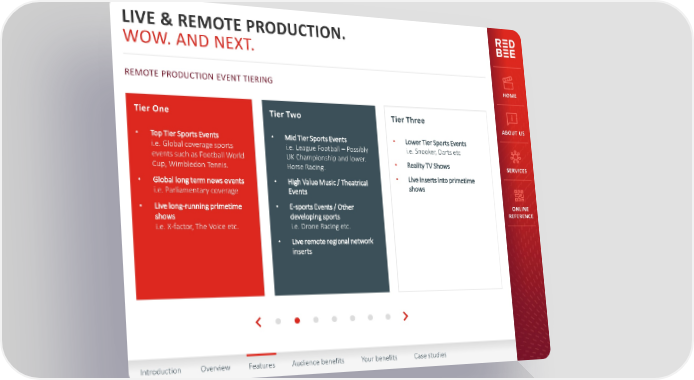 LIVE & REMOTE PRODUCTION. WOW. AND NEXT. REMOTE PRODUCTION EVENT TIERING HOME Tier One Tier Two Tier Three ABOUT US • Top Tier Sports Events • Mid Tier Sports Events • Lower Tier Sports Events i.e. Global coverage sports i.e. League Football – Possibly i.e. Snooker, Darts etc events such as Football World UK Championship and lower. • Reality TV Shows Cup, Wimbledon Tennis. Horse Racing. SERVICES • Global long term news events • High Value Music / Theatrical • Live inserts into primetime i.e. Parliamentary coverage Events shows • Live long-running primetime • E-sports Events / Other ONLINE shows developing sports REFERENCE i.e. X-factor, The Voice etc. i.e. Drone Racing etc. • Live remote regional network inserts Introduction Overview Features Audience benefits Your benefits Case studies