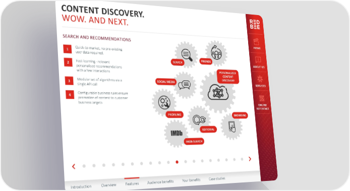 CONTENT DISCOVERY. WOW. AND NEXT. SEARCH AND RECOMMENDATIONS HOME 1 Quick-to-market, no pre-existing user data required. SEARCH FRIENDS 2 Fast-learning - relevant ABOUT US personalised recommendations PERSONALIZED with a few interactions CONTENT Modular set of algorithms via a SOCIAL MEDIA DISCOVERY 3 single API call SERVICES 4 Configurable business rules ensure promotion of content to customer business targets ONLINE REFERENCE PROFILING BROWSING EDITORIAL IMDb SEARCH Introduction Overview Features Audience benefits Your benefits Case studies